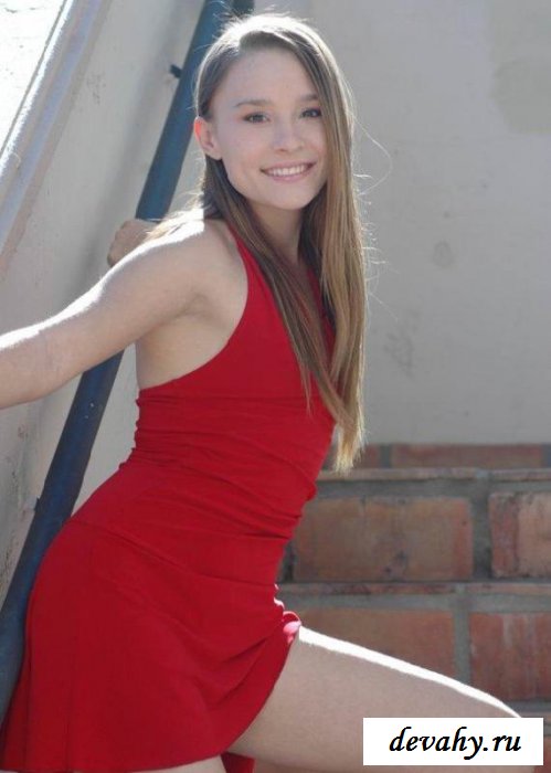 В укромном местечке возле уютного фонтанчика расположилась непонятного поведения девочка в красном платье и такие же цвета босоножках на высоком каблуке. Ее несмелые движения приводят в заблуждение. Не совсем, но раздетая, частями эта хамка украдкой обнажает то сиську, то письку и, оттопырив ногу, бритая пилотка оказывается аккуратной и довольно интересной, а вот она сама явно еще девственница, что выдает невинная улыбка на лице, совсем юное тело и судя по всему она еще даже несовершеннолетняя.