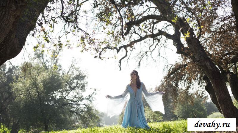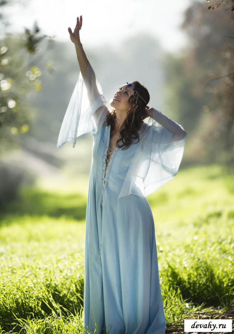 Дама надела шикарное платье в голубых тонах и отправилась гулять на природу. От свежего воздуха принцессной девушкой завладела страсть. Немудрено, что она возжелала оголиться прямо в лесу, ничуть не боясь быть увиденной людьми. Её лоб украшает изумрудная подвеска, эффектно дополняющая сексуальный образ. Первым дело милашка стаскивает верх платья, демонстрируя сиськи. Это необыкновенно её возбуждает, и красотка полностью раздевается. Взгляд сразу падает на волосатый лобок сочной барышни. Мохнатка ничуть не портит даму, а только придаёт сексуальности. Обрадовавшись своему голому телу, королевна страстно поглаживает киску, эротично прикрывая глаза. Она пару раз мелькнула великолепной попкой, когда поворачивалась спиной, ведь сочла это очень даже необходимым.