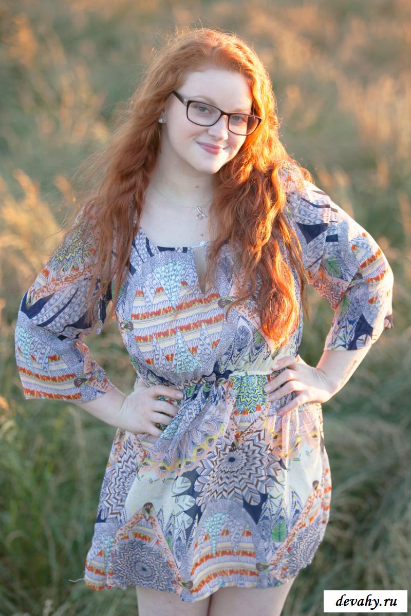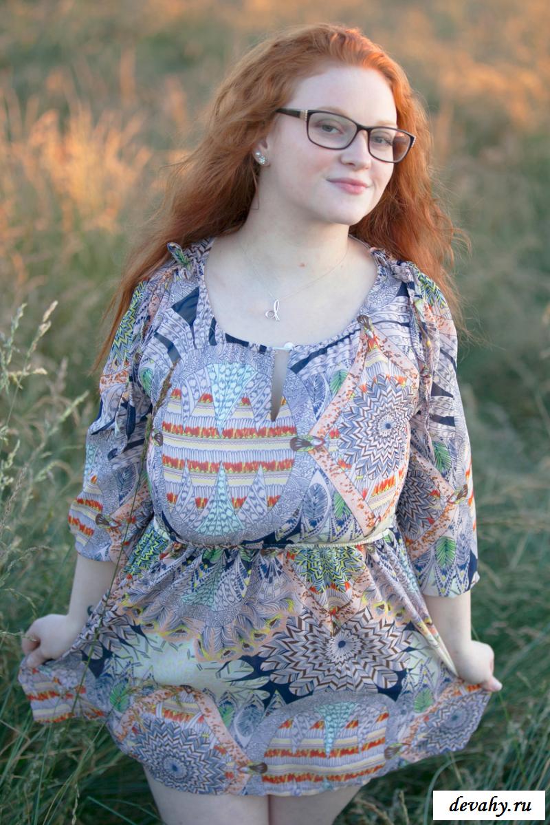 Молоденькая рыжая молодуха одев на себя тонкий и просторный сарафанчик отправилась на прогулку за город. Грудастая раздетая сучка теперь на природе позирует и показывает все свои прелести во всей красе. Подняв свой сарафан, она продемонстрировала отличную голую задницу, которая не была прикрыта трусами. А ее бедра при этом украшали татуировки. И в скором времени она также оголила огромные титьки и сразу же начала прикрывать их руками.