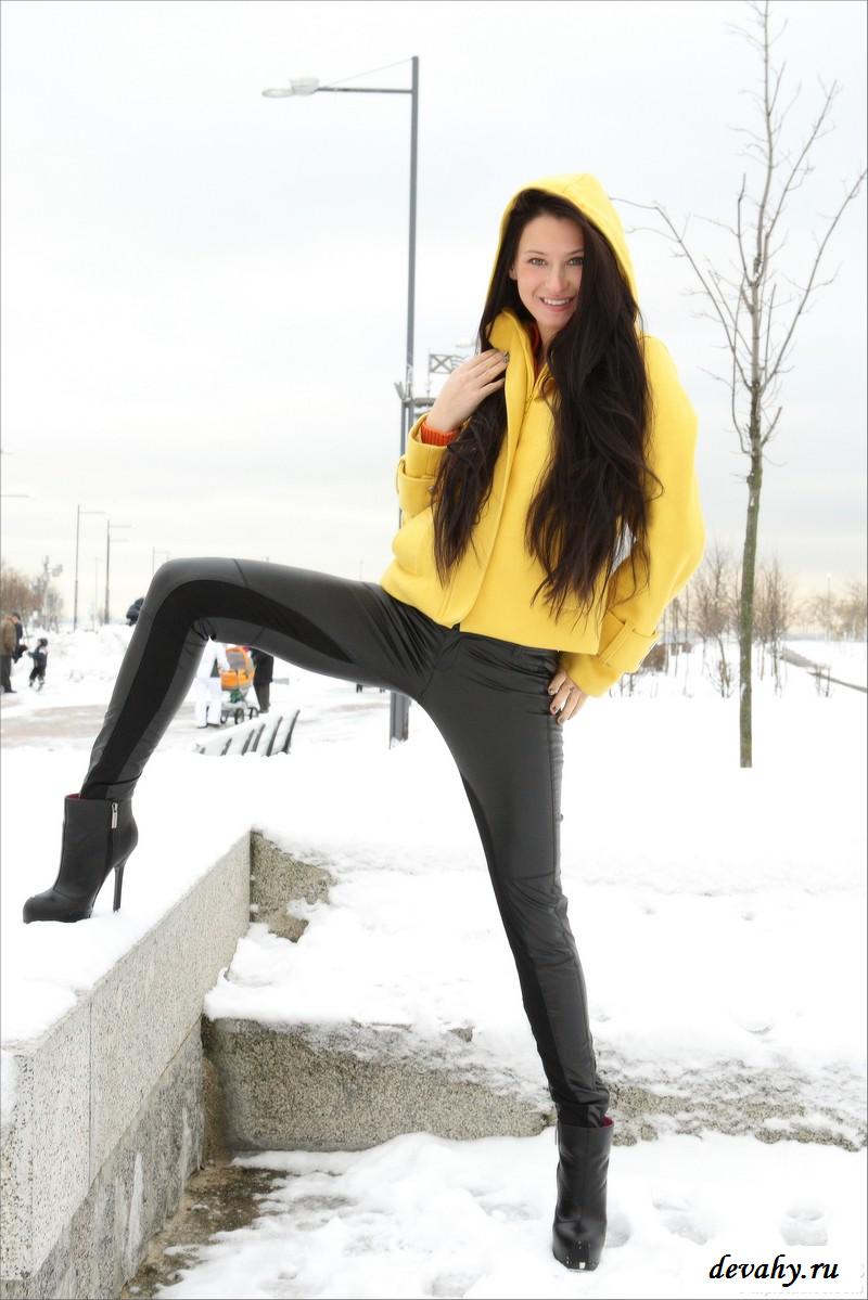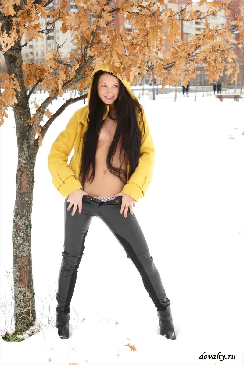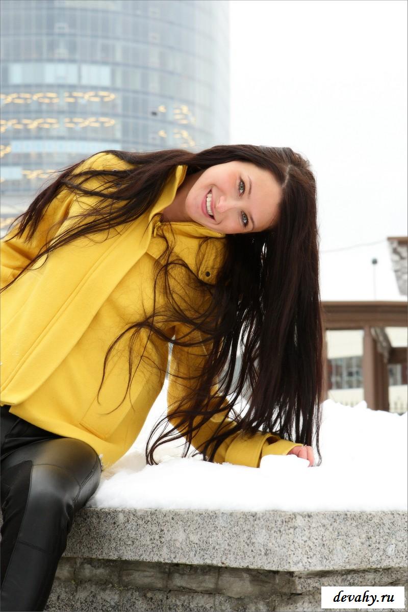 Отличная сучка с тонким телом захотела расслабона и поэтому направилась на прогулку по своему городу, которая завела ее в самые леса. Изначально красотуля с длинными черными волосами и в кожаных лосинах просто гуляла в пределах города, но затем сибирячке захотелось раздеться. И именно таким образом получилась превосходная зимняя эротика с сексуальной телочкой, у которой маленькие титьки. И после того, как она оказалась за пределами городской черты, на ее ножках остались только одни валенки.