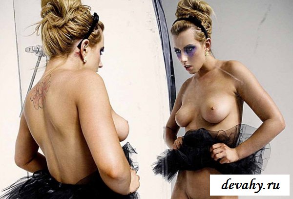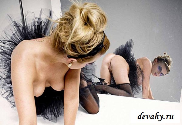 Телочка с обнаженным верхом в пачке изображает черного падшего лебедя. На таких каблуках особо не по танцуешь, но смысл своего танца до нас она донесет. Ее симпатичная упругая грудь эротично, а стягивая пачку сучка покажет свою рабочую манду, и все это мы увидим в ее зеркальном отражении.