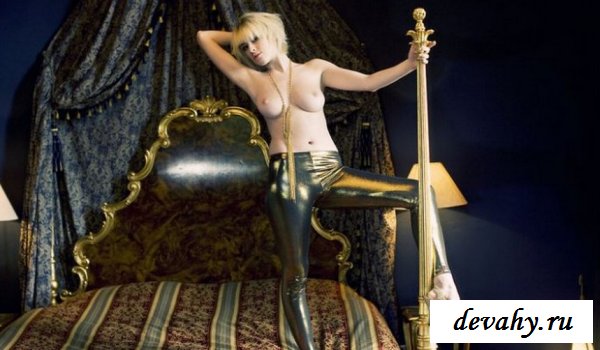 В роскошный особняк парни, дабы скрасить скучный вечер, пригласили стриптизершу для того чтобы она станцевала на королевской кровати свой коронный танец. На танцовщице остались только обтягивающие штаны, но уже скоро ее симпатичная киска с грудью будет доступна для всех.
