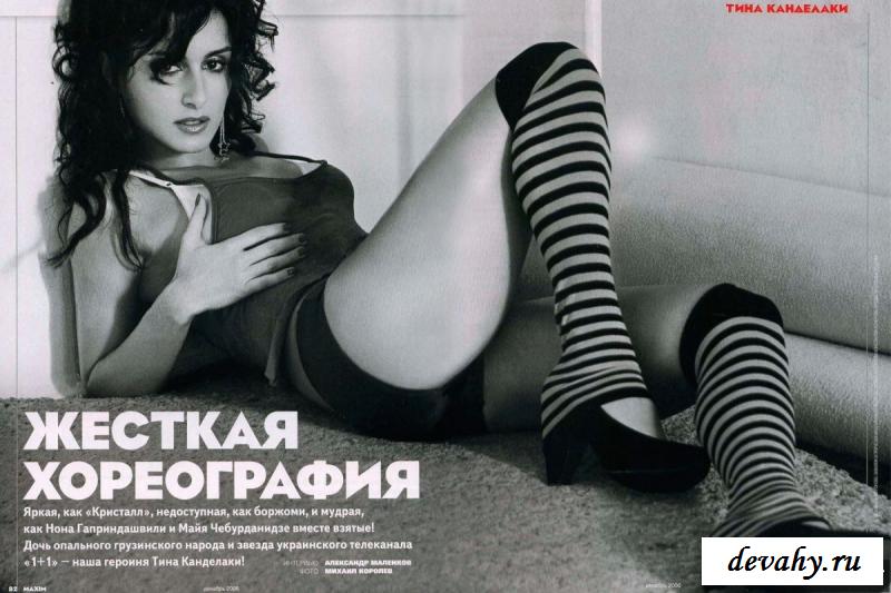 Известная телеведущая по проекту «Самый Умный» Тина Канделаки очень часто появляется на публике в непристойном виде, например, было немало фотографий на которых эта знаменитость была с раздвинутыми ногами и в прозрачных трусах. Также обнаженная брюнетка показала себя во всей красе в нескольких мужских журналах. Конечно, в полной мере тема сисек на этих фото не раскрыта, но зато даже в таком тонком эротичном белье она смотрится идеально.