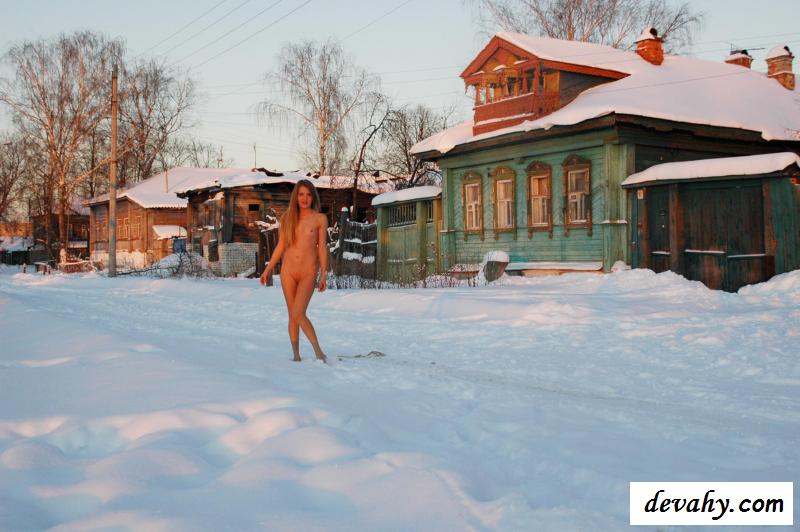 Голая русская девка, когда на улице был лютый мороз, решила направиться за город, чтобы сделать несколько снимков своего красивого, загорелого обнаженного тела на фоне белого снега. И вот теперь она прогуливается по заброшенной деревне и старается как можно быстрее пройти свой путь, чтобы у нее не замерзли гениталии. Чтобы слегка разогреться девица начала играть в снежки вместе с оператором, который давился слюнями на ее шикарное молодое тело.