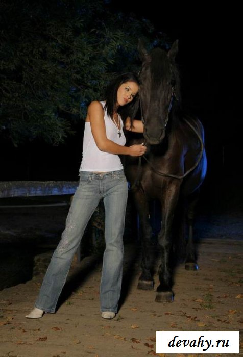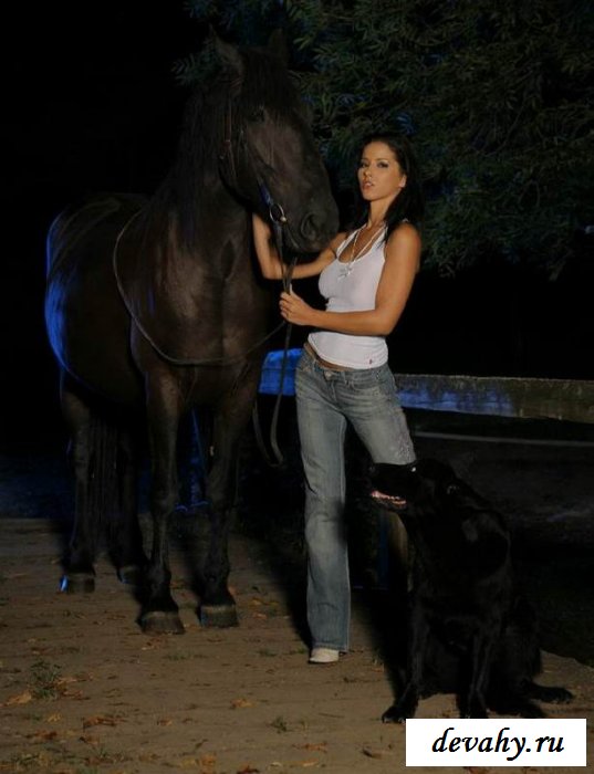 Очаровательная брюнетка подарит вам изумительную ночную фотосессию. На большинстве кадров девица позирует в одежде, короткой майке и джинсах. Но она не лишила вас удовольствия полюбоваться ее изумительной, упругой попкой и крупными прекрасными сиськами. Загорелая девка в ночной темноте с черным конем или лошадью черными псами выглядит довольно эротично. А глядеть на нее увлекательное удовольствие. Стоит раздеться как отличная грудь и манящая пилотка готовы продолжить вечер.