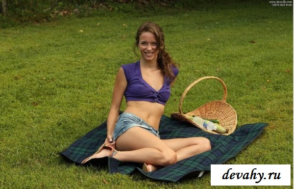 Желание выбраться на природу телочки все таки исполнилось. Найдя полянку с зеленым ковром, стройная девочка удобно расположилась на покрывале, раздеваясь она намазала маслом тело, особенно уделяя внимание груди, почки, ножкам и начисто побритой пилотки.