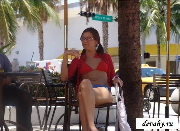 Курортный город, тенистые кафешки, которые с избытком заполняют побережье во время отдыхательного сезона. В одно из этих заведений забрело очкастое чудо в красном лифчике и в коротких джинсовых шортах. Фотосессия, которую она устроила на улицах, аллеях и парках можно назвать несколькими словами, а именно – возьми меня хоть кто-нибудь, хотя есть у нее и некоторые достоинства – небольшие упругие сисичьки, а сама фигура особо не вызывает восторга. Судя по тому, что последний кадр сделан вечером, фотосессия не удалась.