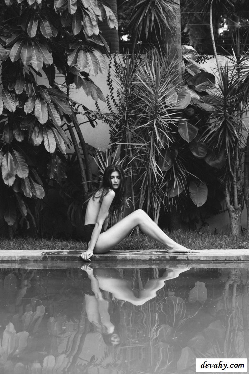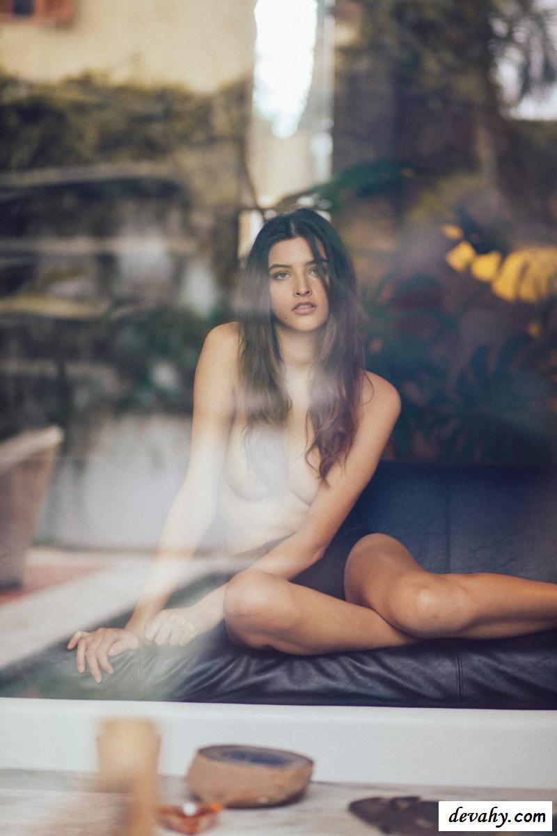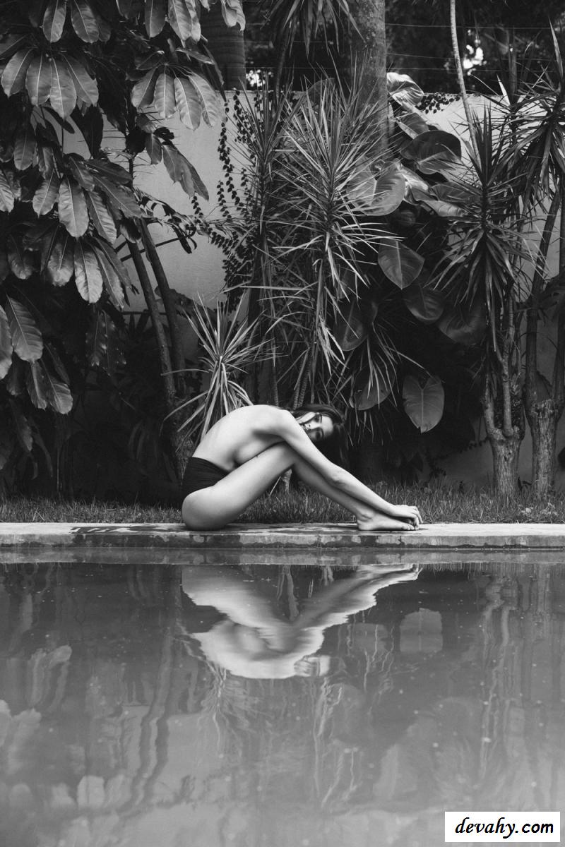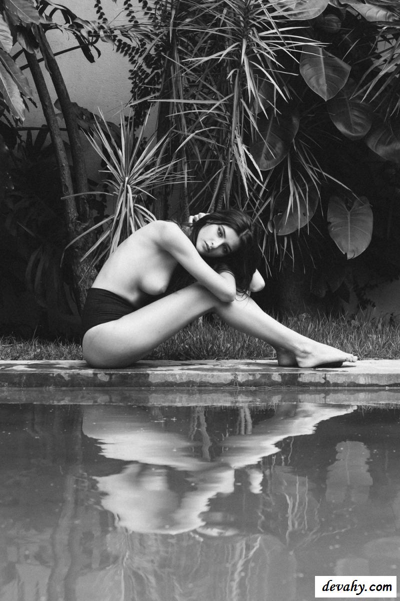 Раздетая худенькая модель после того, как отправилась отдыхать на роскошную загородную виллу, стала там расслабляться и ходить без лифчика. И вот теперь милашка с привлекательными грудями устроила легкую эротику. И изначально она просто сидела на улице рядом с бассейном и хотела в нем немного поплавать, но затем брюнетка передумала и направилась прямо в свой особняк, где под волосами она спрятала титьки второго размера.