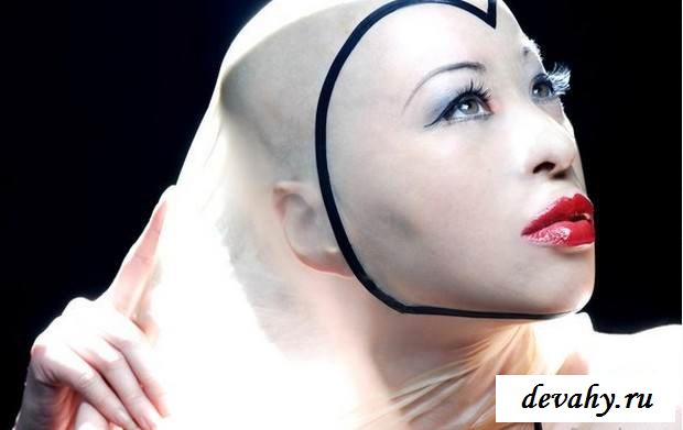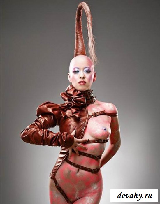 Бритоголовая любительница фетиша для настоящих экстремалов устроит небольшое шоу. Стоит предупредить сюда лучше зайти только у кого в порядке с нервами. Будет маленький экскурс в мир садизма и жестокости, благо это все постановочное. Лысая баба специально побрилась, чтобы удобно было одевать на себя различные костюмы из латексах и прочей хрени. В общем фигура у лысей дьяволицы симпатичная, сиськи также вполне хороши, в основном она выступает раздетой демонстрируя вязь затейливых татуировок.