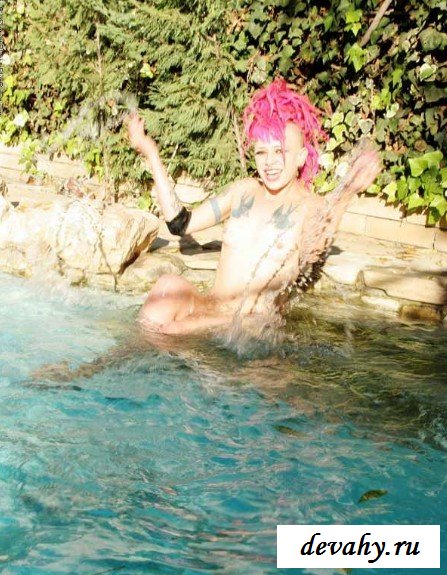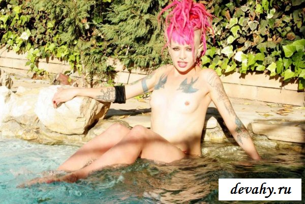 Девочка очень "яркая", во всех смыслах. Симпатичная телка слегка лысоватая с большой розовой гривой и зачем так изуродовать свою внешность. Она вся кольцах, и на интимных местах, и на лице. Татуировки у нее по всему телу, а купаясь в бассейне она покажет свои оставшиеся прелести.