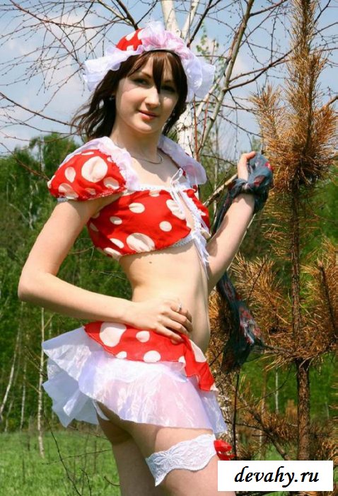 Эротичная шлюшка в костюме красной шапки решила показать себя. Вот честно на месте волка я б съебался от такого чуда в таком наряде, так что просека в густом лесу осталась бы. Хотя мордаху вполне ничего. Хоть дивчина и стремная, но отправится покорять на лесную опушку местных волков Ее заводит внимание со стороны, хоть живность и разбежалась, но есть вероятность увидеть лесника. Крошечные сиськи барышни тонущих в зелени вполне для деревни сойдет, ровна как и привлекательный голенький задок с киской.