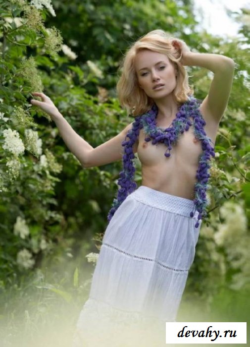 В белой длинной юбке ласковая девочка гуляет в саду под солнечным весенним днём. Молодая красотка с неприкрытой грудью срывает цветок и пытается гадать на счастье и любовь, на сегодняшним вечер с новым своим ухажером. С короткой стрижкой блондинка обладает обаятельной грудью, соски такие симпатичные маленькие и торчащие. Девица с приятной внешностью сильно завышает её самооценку, из-за этого лапочка стала недоступной для многих, но для нас исключение и прекрасная эротика от нее для нас.