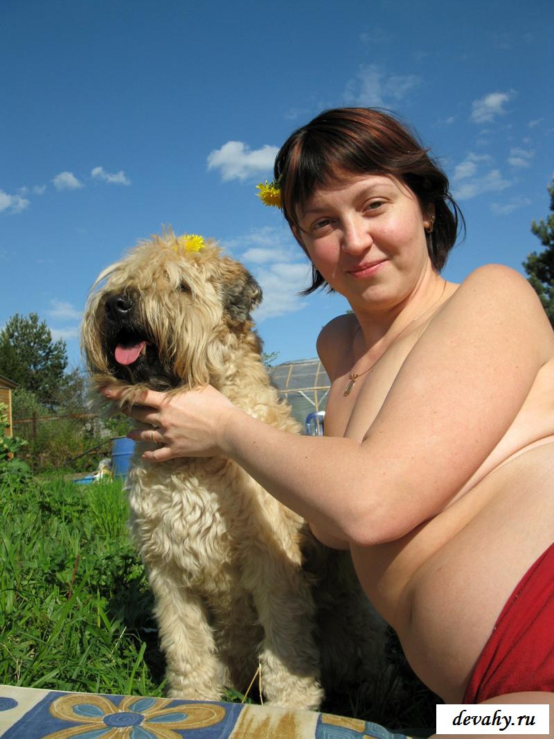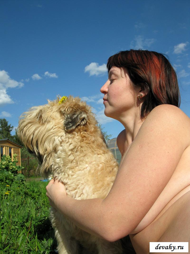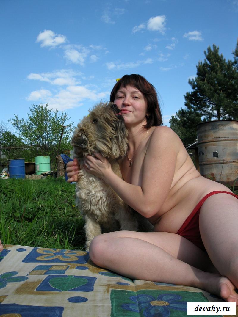 Зрелая женщина приехала отдохнуть на свой загородный участок, где всегда любила погреть булки на солнышке и расслабиться. Обнаженная сорокапятилетняя тетка после того как разложила сумки отправилась на улицу со своим псом и решила снять из себя всю одежду. Прямо под палящим солнцем эта извращенная сучка начала отдыхать и показывать себя во всей красе. Особенно она акцентировала внимание на своем мохнатом лобке, а также небольших висячих дойках.
