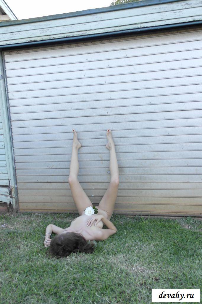 Во время отдыха на даче кудрявая телочка решила одеть на свое тело откровенный черно-белый купальник. Но вскоре ей захотелось раздеться прямо у деревянного забора, когда увидела, что за ней наблюдает сосед, который ей уже много лет нравится. Сначала телка стянула лифчик, после этого встала на четвереньки и покрутила немного перед ним задницей. В конечном итоге она решила избавиться и от низа, чтобы все желающие смогли увидеть ее вагину.
