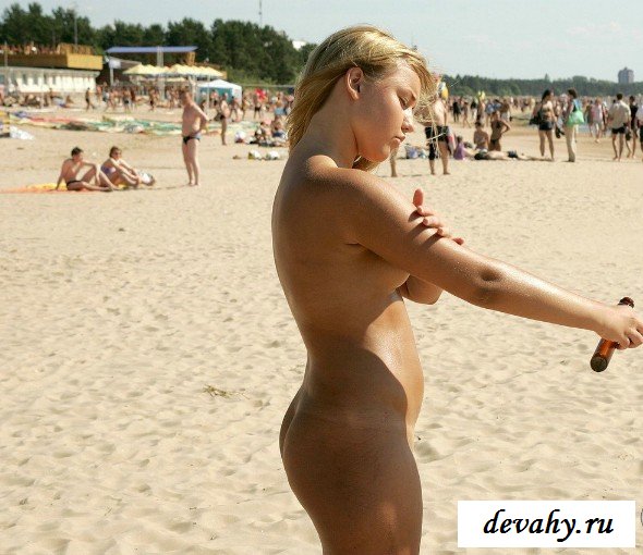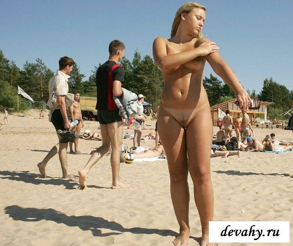 Слегка упитанная девушка без комплексов, пришла на пляж загорать голышом, ее мало волнует, что на всем пляже нет ни одного голого человека, все купальниках, ей все равно, что на нее все смотрят, смотрят на ее торчащие соски с сиськами, на выбритую промежность.