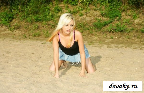 Худенькая блондинка в юбке и майке отдыхает на пляже, загорает и радуется жизни. Сняв одежонку, девочка останется в соблазнительном откровенном купальнике, ее стройное тело готово к обнажению, но оказалась стеснительная и только слегка оголит не большую грудь.