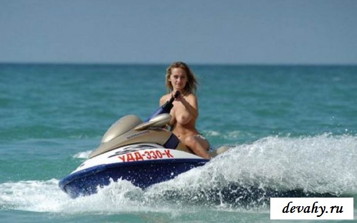 Огромный океан раскинул свои бескрайние просторы с чистой голубой водой на первый взгляд если не считать соли, то кажется профильтрованный. Большой водный мотоцикл смотрится совершенно маленьким в присутствии эротической красавицы без нижнего белья с энтузиазмом катающейся на волнах. Подтянутая и жилистая фигура интересна сама по себе. Вот конечно лицом просто сказать не удалась, но как она резво выполняет упражнения и развивает большую скорость, в постели, скорее всего, просто экзотика.