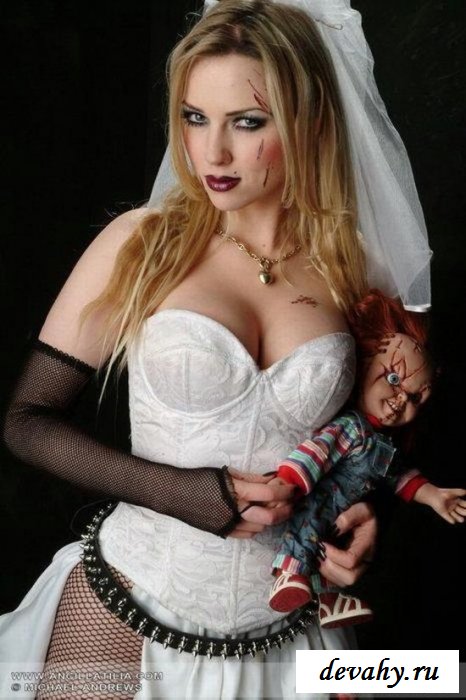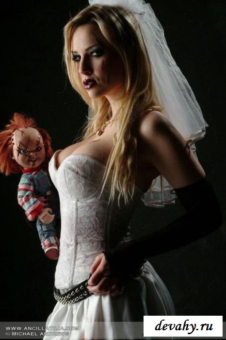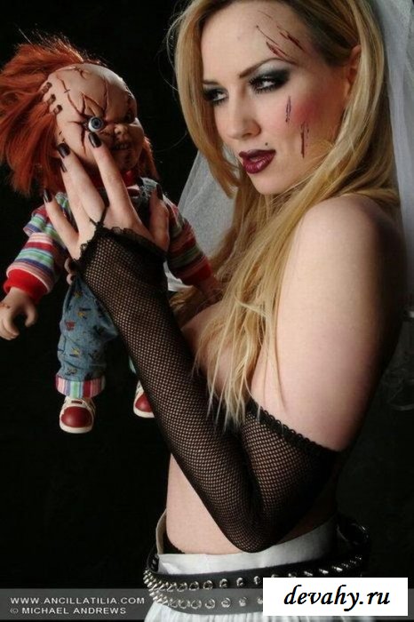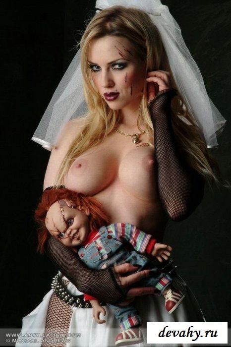 Перед нами голая невеста, которая придумала стиль предсвадебной фотосессии. Здесь не только потрясающие элементы эротического сценария, но и ужасы, которые исцеляются от её лица. Тёмные тона макияжа делают будущую жену больше похожей на вампиршу, которая жаждет отведать чужой плоти. Но давайте об этом не будем, так как куда интереснее тема сексуального характера. Ведь обнажённая малышка достаточно хороша собой, что особенно касается всех её раздетых интимных мест на теле.