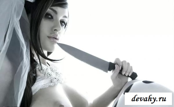 Да, таких невест у нас еще не было. Откровенная грудастая невеста, решила показать себя. Пожалуй, это самая странная и не обычная невеста, которых доводилось видеть. Скорее всего невесту бросили, об этом говорит размазанная тушь и нож в руках, ох напрасно ее бросили.