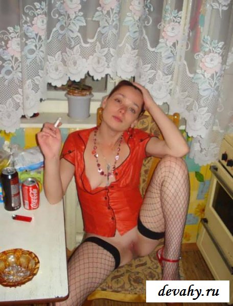 Сука сидит на кухонном табурете и тянет пиво, а заодно и курит жадно дымя. Одна нога согнута в колене и не привлекательная пизда раскрыта. Побухав она пьяной отправилась в спальню, где окончательно разделась, и продолжила расставлять ноги, широко их раздвигая.