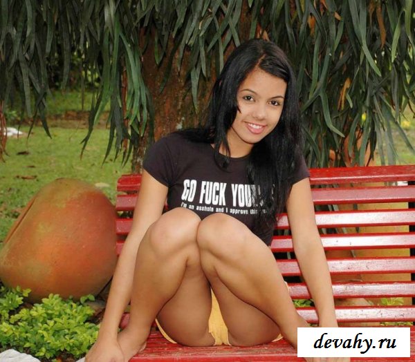 Короткая футболка и желтые шортики украшают молоденькую даму. Усевшись на скамью сучка снимет одежду, а полупрозрачные трусы с лифчиком она снимет чуть позже. Оказавшись окончательно голой, телка достанет длинный толстый огурец и став раком выебет им себя в узкое очко.