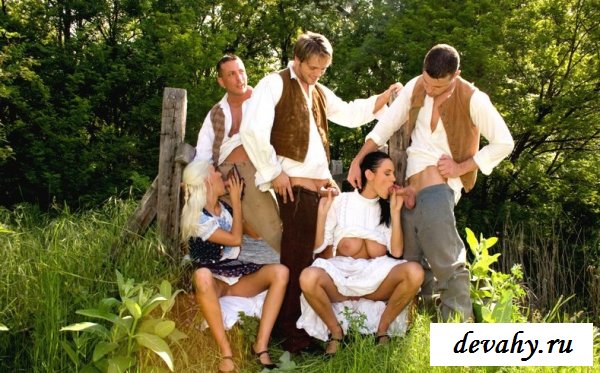 Группа молодых людей изобразили время прошедшего столетия, когда телки ходили в длиннющих платьях, а мужики в чем придется. Трем чувакам достались две сучки на растерзание, которые хорошо сосали и трахались, позволяя голодным парням иметь их во все дырки.