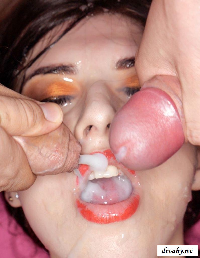 Мужики спустили сперму голой телке в рот