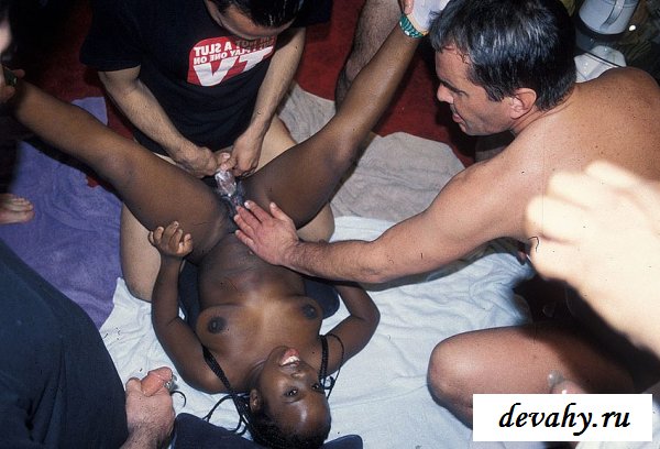 Толпа мужиков со стоячими членами по очереди ебут негритянку карлика. Черная сучка стоит голой среди голодных мужиков и не торопясь сосет тот член, который ближе всего, пока она без члена во рту ее ебут в хлюпающую от возбуждения в пизду хуями в презервативах.