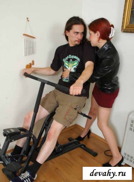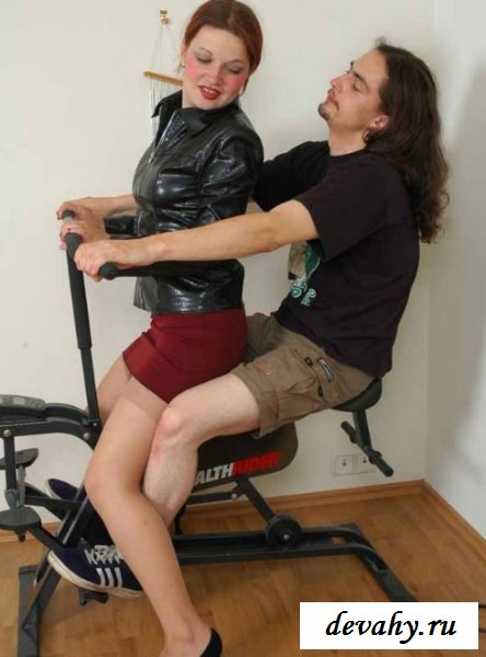 Рыжая девочка зашла в комнату и обнаружила своего приятеля на любимом тренажёре. Это ее разозлило и она попыталась тоже сесть на тренажер, видя тщетность попытки, девка стянула волосатого чудака на пол и заставила лизать свой зад. От возбуждения парень порвал ее колготы и трахнул, не дожидаясь пока она разденется.