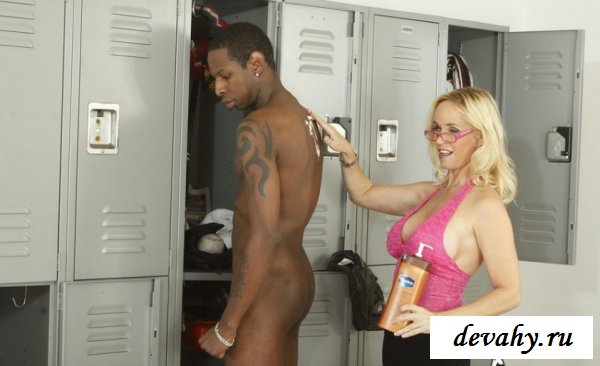 После тренировки, молодой негр отправился в раздевалку. Полностью раздевшись он принял душ и собрался одеться, как увидел фанатку предлагающую ему по массажировать спину. Не долго его член без дела висел, телка быстро подняла его губами, а потом негритос выебал суку прямо на скамье
