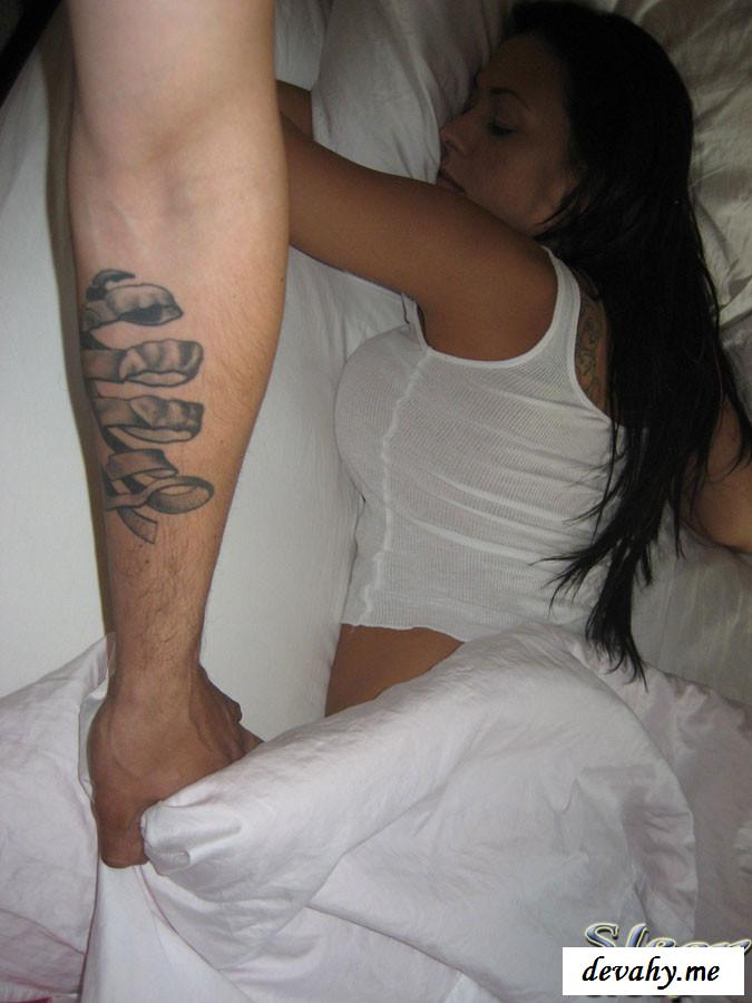 Однажды когда парень зашел к себе в комнату, то там на белой кровати он увидел спящую подругу. Именно в таком виде он решил с ней заняться сексом. Чтобы она выглядела еще сексуальнее, он оголил ее груди с проколотыми сосками, а уже затем приложил свой член к ее губам. Вскоре брюнетка проснулась от того, что почувствовала в своей вагине стоячий член молодого человека и уже в создании стала с ним трахаться и стонать от возбуждения.