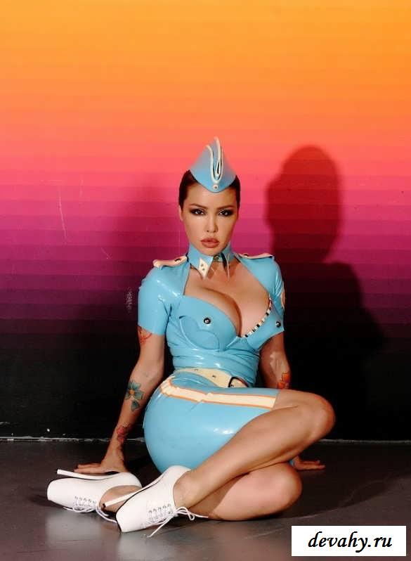 Стройная грудастая телочка устроила очаровательную фото сессию, в котором легко ты оценишь стильную и одновременно пошлую телочку, способную на многое. Обнаженная стюардесса в латексе сразит своим нарядом и сможет удивить. Её тело будет принимать самые разновидные позы, а сама девица будет возбуждаться лишь от одной мысли думаю о сексе и безусловно же ласок собственного тела. Скинув наряд раздвинет ноги, сука промокает все больше. Стоит заценить ее татушки.