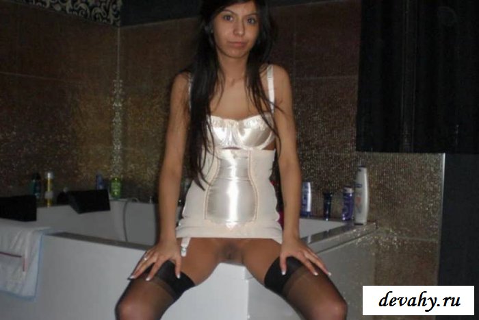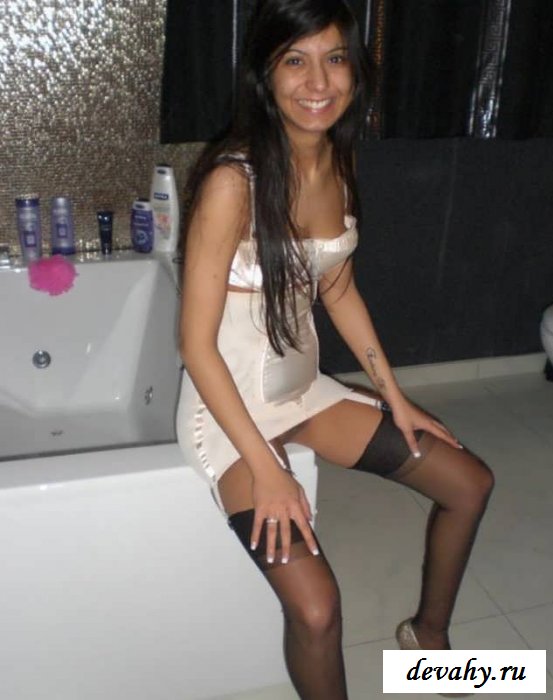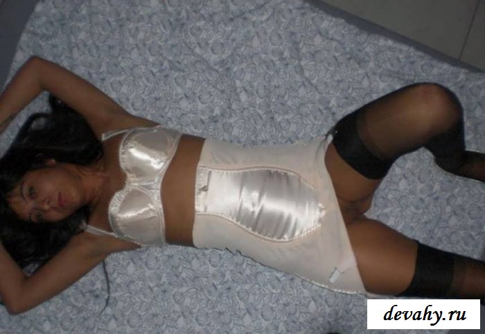 Роскошная татарская девчонка с длинными черными волосами подарит свое обалденное и упругое тело своему вредному зрителю, а пока парнишка с немыслимым возбуждением фоткает подружку, как его девчонка позирует в своей комнате с огромный кроватью и изысканной обстановке. В атласном белом корсете, золотых туфлях, черных чулках и сексуально демонстрирует свое загорелое тело в ракурсах, в которых видны все прелести, можно рассмотреть ее пилотку, хорошенькую попу. Короче на кого вздрачнуть есть