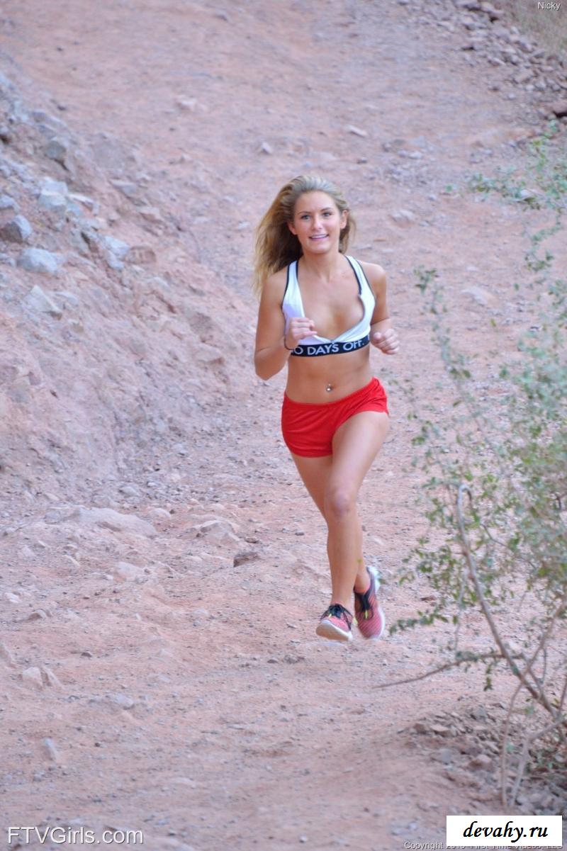 Девушка очень следит за своей фигурой и потому каждый день совершает длительные пробежки. Благо, красотке повезло: она живет в горах и ей есть, где развернуться. Одетая в красные шорты и футболку, милашка как обычно вышла побегать. Но так как блондинка - та еще шалунья, она стала расстегивать обтягивающую блузку, мелькая грудями. На глазах у прохожих, леди снимала шортики, показывая соблазнительную, голую попу. Спортсменка садилась на корточки и, подвинув трусики - возбуждала видом голенькой киски. Покорив гору, блондинка полностью оголилась, победно держа шортики над головой.