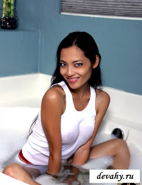 Девочка приготовила себе ванну с пеной и не много повиляв задницей, погрузила свое тело, как была в майке и трусиках в воду. Прилипшее мокрое белье, красиво выделяет ее сиськи с пилоткой. Снимая мокрое белье она покажет покрасневшую и возбужденную пизду в пене.