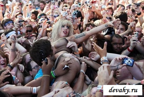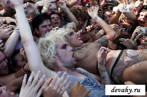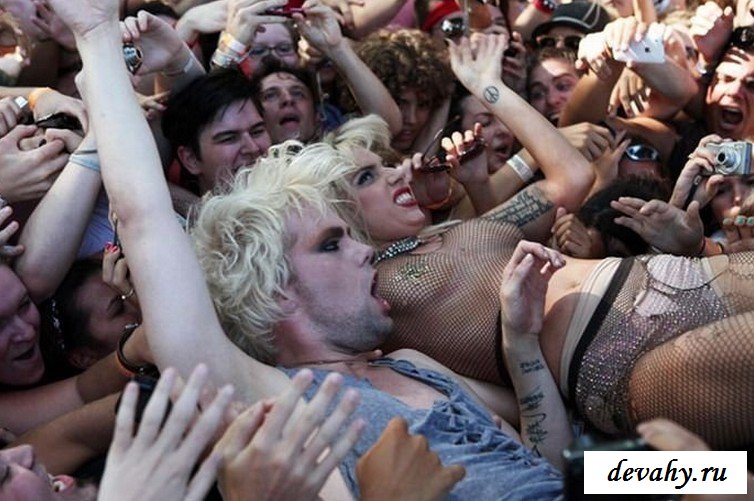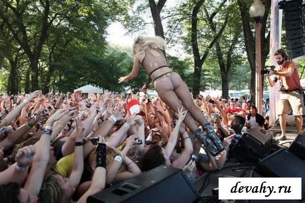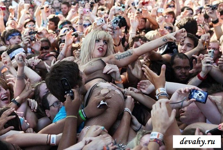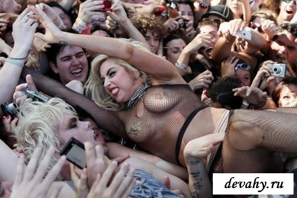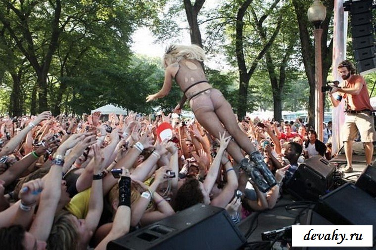 Lady Gaga выступала на какой-то богом забытой сцене, пару сотен ее фанатов рвали глотки тянули руки к своей знаменитости, дурея от вида ее сисек в откровенном наряде. Потоптавшись на сцене и по корчив рожи она сиганула в толу фанатов, в итоге порванный костюм и все та же не довольная рожа.